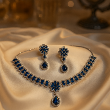Make a regal statement with the Majesty Set, featuring a necklace and earrings adorned with royal blue stones and shimmering accents.