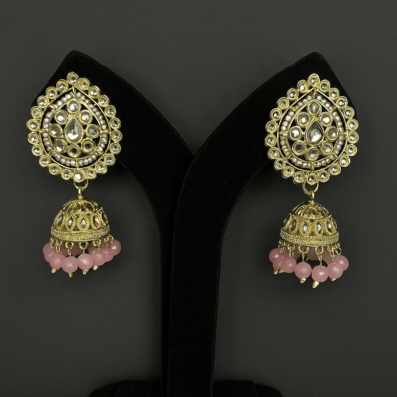 Step into elegance with our Amara Kundan Jhumka, where timeless craftsmanship meets a refreshing pop of color. These earrings feature intricate Kundan work in a traditional circular pattern, gracefully finished with a dome-shaped jhumka.