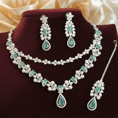 Radiate grace with the Mint Serenity Pearl Necklace Set, a mesmerizing fusion of mint green gemstones, lustrous pearls, and dazzling cubic zircons. The dual-layered necklace drapes beautifully around the neckline, highlighted by a blush pink drop pendant, while the matching earrings complete the look with refined charm.