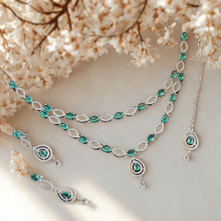 The centerpiece pendant, a pear-shaped emerald encircled by sparkling diamonds and crowned with a teardrop accent, adds a touch of sophistication and allure.