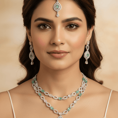 Double-layered necklace with teardrop diamond accent earrings and maangtika.
