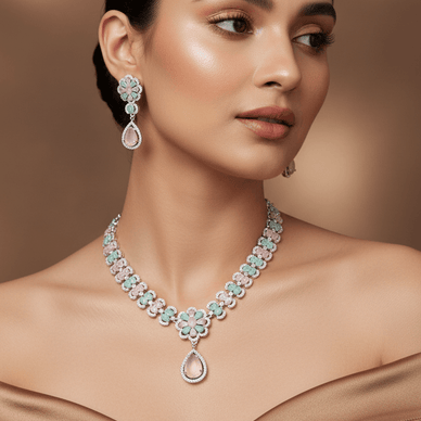 Grace your neckline with timeless elegance — the Blush & Mint Floral Drop Necklace is a harmonious blend of pastel beauty and sparkling brilliance. Designed with alternating blush-pink and mint-green stones, this necklace blooms with floral-inspired motifs along its chain. At the center lies a delicate teardrop pendant, framed with shimmering crystals, adding a touch of luxury and sophistication.