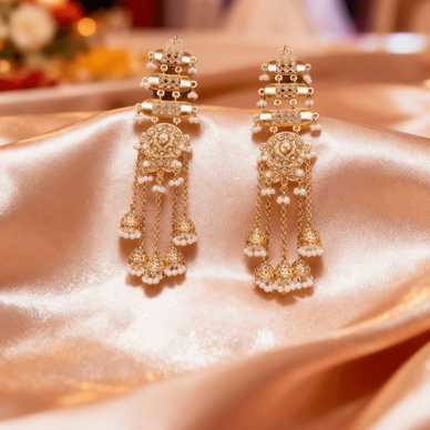 An exquisite pair of long heritage-style chandbali earrings, crafted with intricate filigree detailing and adorned with uncut kundan stones and miniature pearl beads. The cascading jhumka-style chains add a regal touch, creating a perfect blend of traditional charm and luxurious elegance.