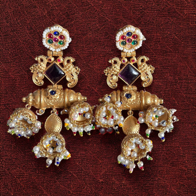 The Mayura Ratna Jhumkas are a regal pair of traditional earrings inspired by the elegance of ancient temple jewelry. Adorned with intricate peacock motifs and multi-hued gemstones, these earrings celebrate the grandeur of Indian heritage. Each earring features a square-cut gemstone centerpiece surrounded by detailed gold craftsmanship, delicate pearls, and vibrant bead accents that add a festive charm.