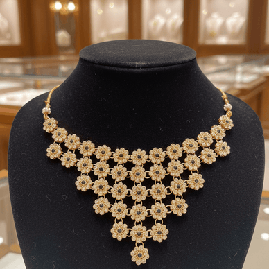 The cascading floral design creates a graceful silhouette, making it a perfect adornment for weddings, festive gatherings, or special occasions. Whether paired with a saree or lehenga, this set adds a radiant glow and regal sophistication to your look.