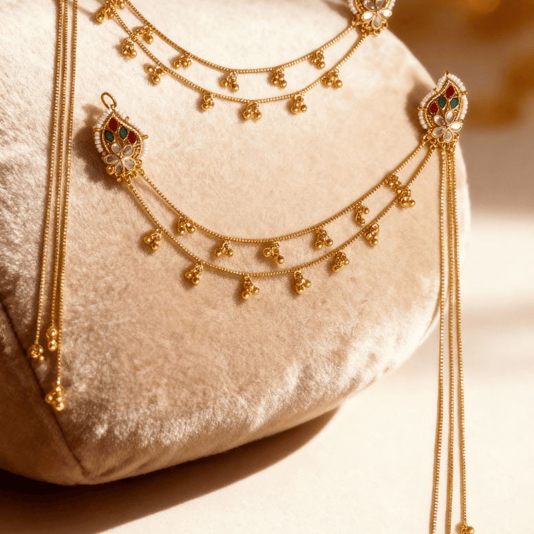 Elevate your traditional look with this exquisite Kundan and multicolor stone hair chain earring set, designed to embody royal elegance and charm. The statement earrings feature intricate Kundan craftsmanship, accentuated with vibrant red, green, and white stones that exude timeless beauty. Delicate gold-plated chains cascade gracefully, connecting to matching side clips, creating a luxurious and regal drape across your hair or shoulders.