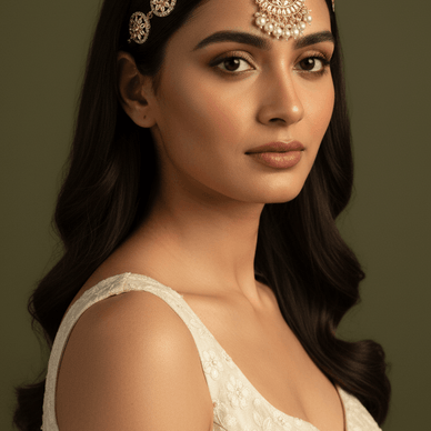The maangtika sits gracefully at the center of the forehead, while the mathapatti extends elegantly along the hairline, creating a balanced and majestic look. Its lightweight yet luxurious design ensures comfort throughout long celebrations.