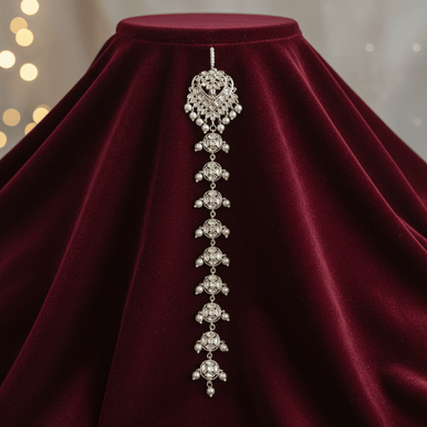 The Royal Pearl Braid Ornament is a beautifully crafted hair accessory designed to add elegance and tradition to your braid. Featuring an ornate dome-shaped top embellished with delicate pearl droplets, the design cascades downward in a graceful sequence of finely detailed floral motifs. Each element adds movement and shine, making this ornament perfect for weddings, festive events, and traditional celebrations.
