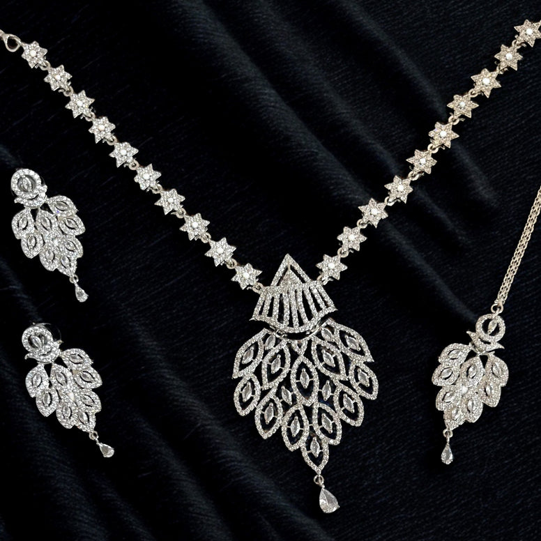 The Starlit Grace Set is an enchanting jewelry ensemble that radiates elegance and poise. Featuring a delicately crafted necklace adorned with star-shaped motifs leading to an intricate cascading leaf-inspired pendant, this set is a true masterpiece. The matching earrings and pendant echo the same detailed artistry, creating a harmonious balance of sparkle and sophistication.